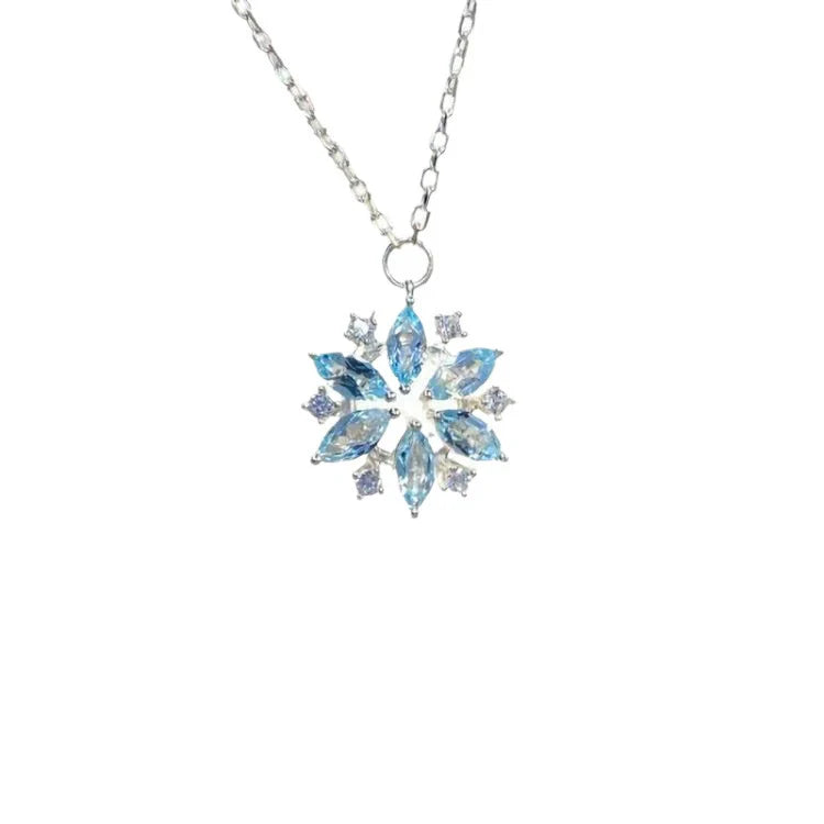 Embrace winter's enchantment year-round with our exquisite Crystal Snowflake Pendant. This delicate piece showcases a meticulously crafted snowflake design adorned with shimmering blue topaz-inspired stones and brilliant moissanite accents, creating a captivating play of light that draws the eye.