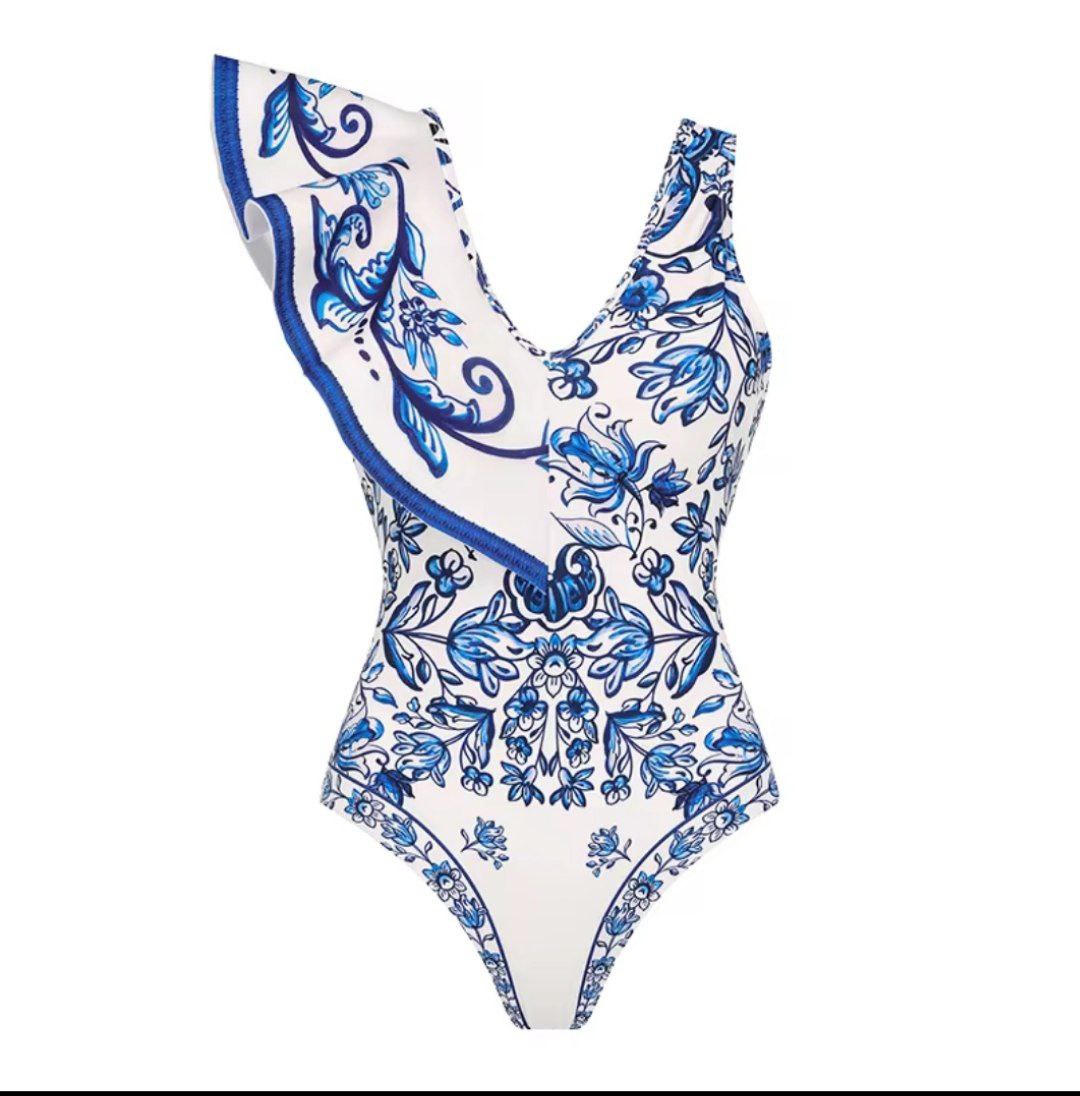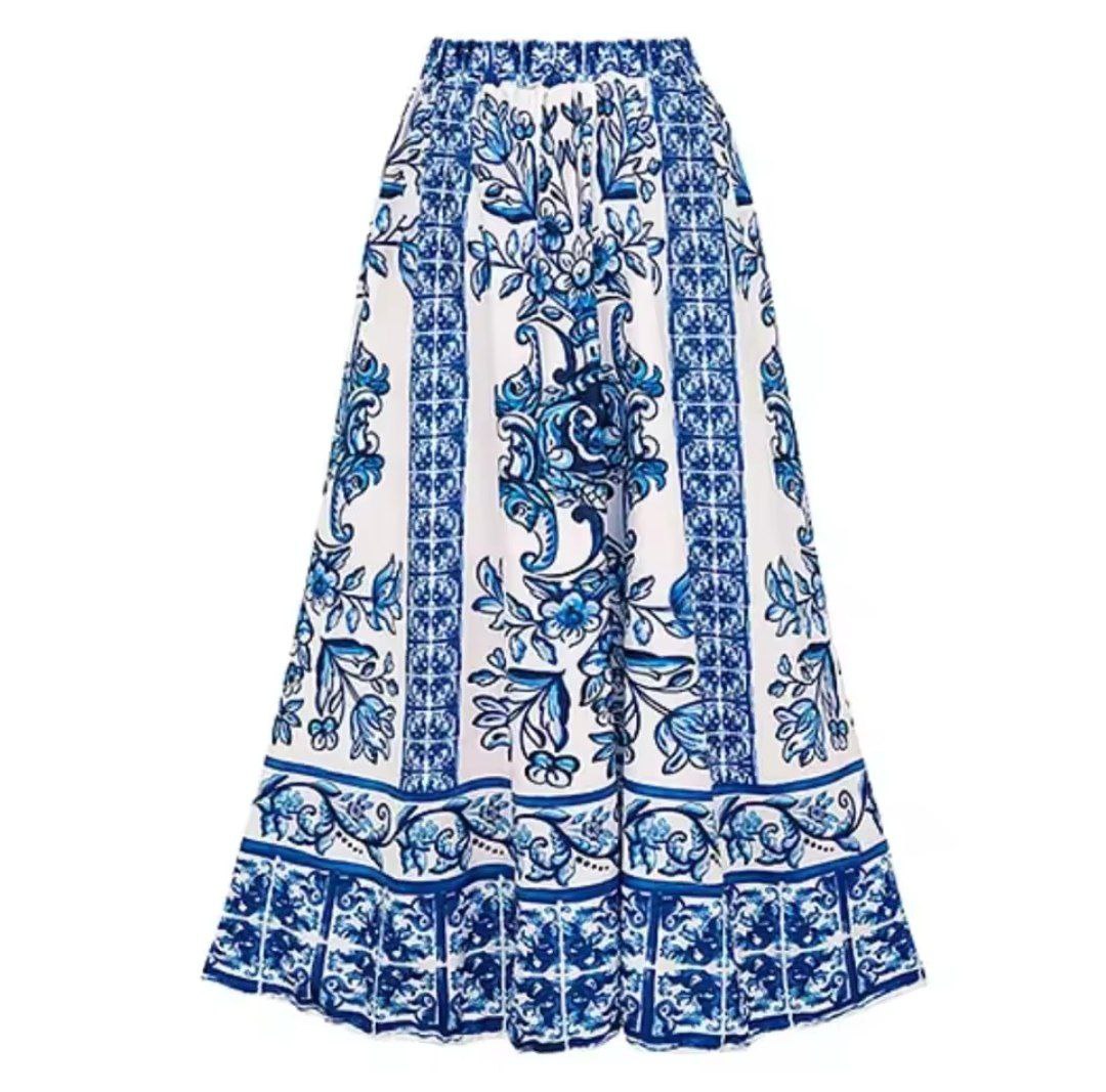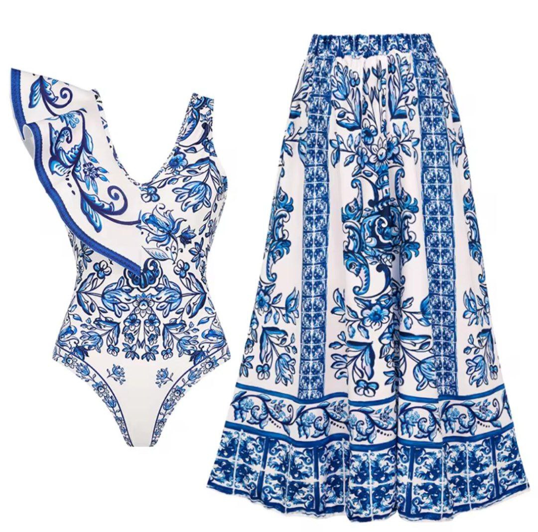 Transport yourself to the sun-drenched shores of the Mediterranean with our exquisite Swimwear Collection. This stunning two-piece set features a sophisticated one-piece swimsuit and coordinating maxi skirt in a breathtaking blue and white porcelain print that evokes the classic beauty of Greek ceramics.